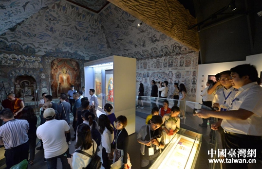 兩岸嘉賓參觀張大千博物館內現場實景復原的“敦煌石窟”。(圖片來源:四川省臺辦)