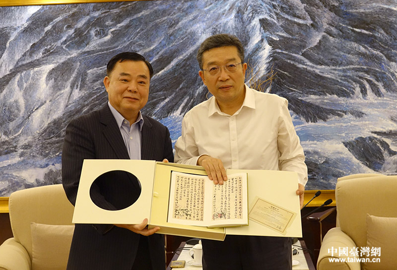 中共上海市委常委鄭鋼淼會見桃園市議會議長邱奕勝率領(lǐng)的桃園市里長聯(lián)誼總會參訪團一行。圖為雙方交換禮物。(來源:上海市臺辦)
