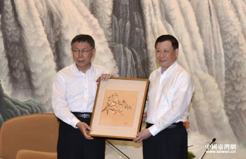 應(yīng)勇贈(zèng)送柯文哲市長(zhǎng)“雙喜如意”的繡品,寓意吉祥。(中國(guó)臺(tái)灣網(wǎng)發(fā))