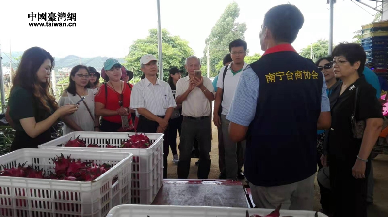 中國臺灣網8月6日訊 7月24日,臺灣南投縣議員張嘉哲率南投縣鄉土文化參訪團一行25人到廣西南寧市青秀區長塘鎮,參觀臺灣精品農業園內的南寧市金之都農業發展有限公司火龍果基地和南寧市泰萌農業有限公司的釋伽基地,了解臺灣水果在當地的生產、銷售和特色農業產業建設情況。