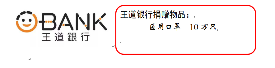 王道銀行天津代表處自泰國采購10萬只醫(yī)用口罩,捐贈天津市抗擊疫情。
