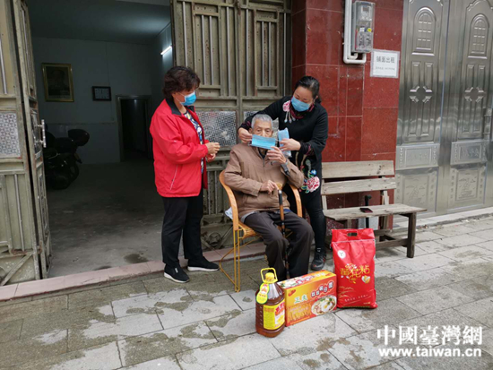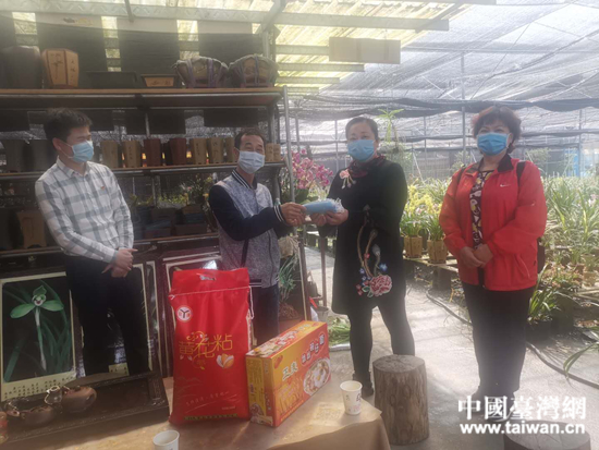 廣西玉林市容縣臺辦主任曾漢萍到臺胞葉國斌蘭花園走訪,送上口罩和生活物資。 (中國臺灣網 發)