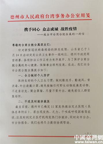 德州市臺辦還向臺商臺胞臺屬發出一封信,呼吁他們做好防護、配合聯防聯控、穩慎開業復工、加強涉外風險管理,并提供肺炎醫療救助定點醫院、發熱門診信息。