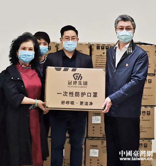 曾衛東向伯峰茶業,米樂嘉餐飲兩家臺企代表贈送防護口罩。 (中國臺灣網 發)