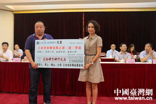 青上公司總經理助理陸軍輝向三水區贈獎助學金。 (中國臺灣網 發)
