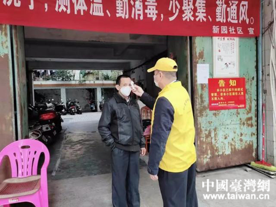 中國臺灣網4月8日訊 據廣東省臺辦消息,新冠疫情防控期間,設在廣東省汕尾市城區新園等社區執勤檢查的崗位上,經?吹揭粋忙碌的身影,協助對來往人員、車輛進行登記、測量體溫、應對咨詢等,他就是臺灣同胞賴以尊。