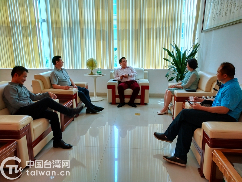丘德彬與微團(tuán)科技集團(tuán)有限公司董事長吳育政、廣西達(dá)鑫智能科技有限公司董事長莊峰榮座談交流。(圖片來源:廣西玉林市臺(tái)辦)