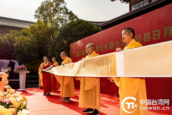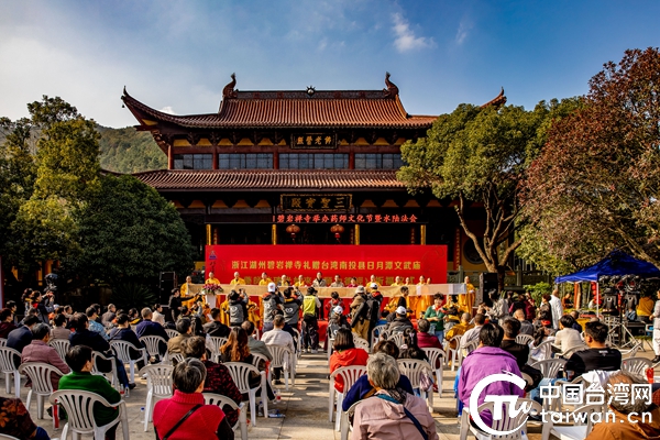中國臺灣網11月19日湖州訊 2019年碧巖禪寺向南投縣日月潭文武廟敬贈東方三圣藥師琉璃佛像,值此一周年之際,11月15日,浙江湖州碧巖禪寺舉辦了隆重的祈福儀式,再次禮贈南投縣日月潭文武廟《藥師佛經》一部。昆山、杭州等地近100名臺商臺青參加現場活動。
