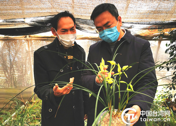 玉溪市委統戰部常務副部長何國斌(右)到洪文山蘭花基地調研。(玉溪市委臺辦供圖)