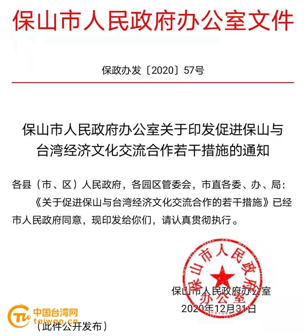 《保山市人民政府辦公室關于印發促進保山與臺灣經濟文化交流合作若干措施的通知》。(圖片來源:云南省保山市臺辦供圖)
