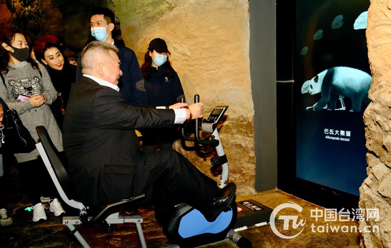 成都臺(tái)協(xié)會(huì)會(huì)長(zhǎng)高錦樂(lè)體驗(yàn)踩腳踏車(chē)看熊貓演變史。(圖片來(lái)源:四川省臺(tái)辦)