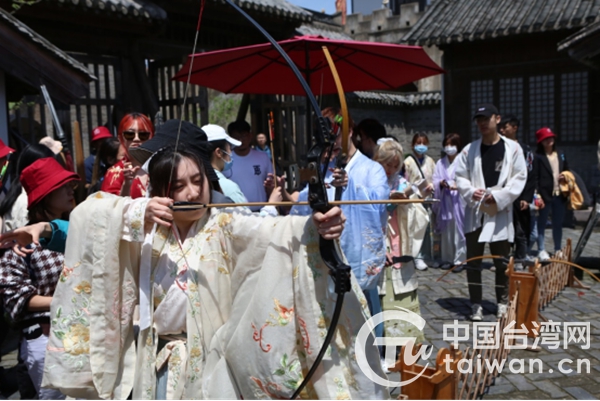 座談會后,參與活動的臺青們還來到象山影視城體驗中華傳統文化。第一次穿上古裝的臺生感到十分新奇,在“古城”中與金庸武俠小說中的經典人物來了一場穿越時空的對話。臺青們還實地體驗了皮影戲、射箭、電影配音等不同的文化項目。
