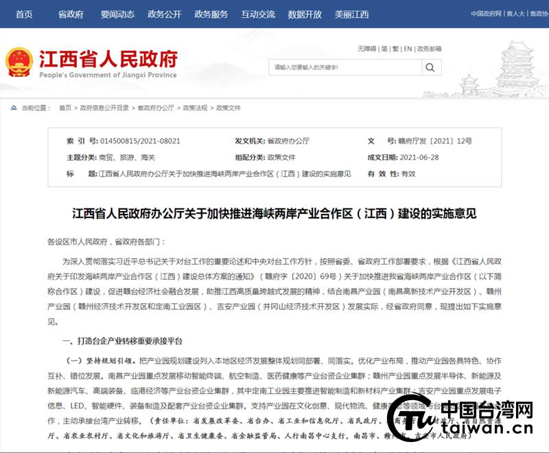 中國臺灣網7月14日訊 江西官方近日公布《江西省人民政府辦公廳關于加快推進海峽兩岸產業合作區(江西)建設的實施意見》(以下簡稱《實施意見》),強化對重大臺資項目支持、推動集群發展,支持臺企擴大對外貿易、拓展內需市場,支持合作區引進臺灣地區人才……促進贛臺經濟社會融合發展。