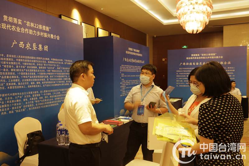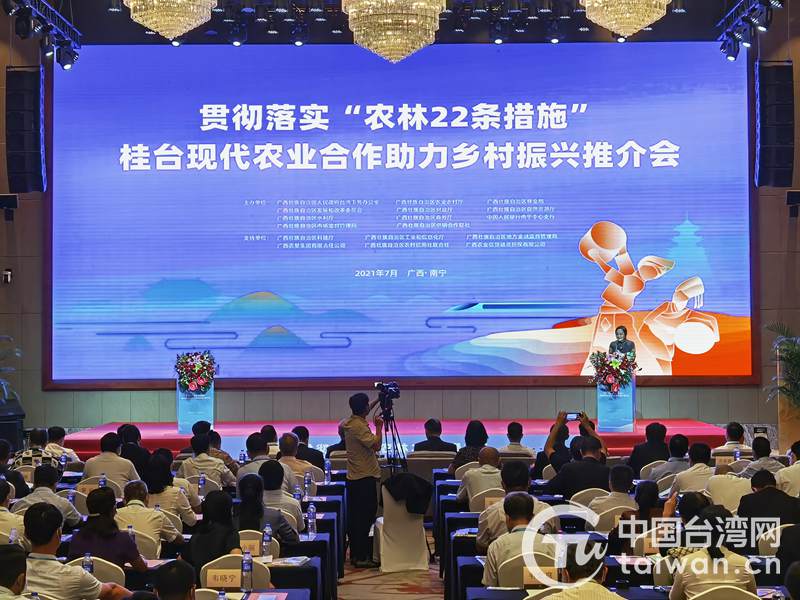 中國臺灣網(wǎng)7月21日訊 7月19日,廣西壯族自治區(qū)臺辦、農(nóng)業(yè)農(nóng)村廳、林業(yè)局等17家單位在廣西南寧共同舉辦“貫徹落實‘農(nóng)林22條措施’桂臺現(xiàn)代農(nóng)業(yè)合作助力鄉(xiāng)村振興推介會”,探索“十四五”桂臺現(xiàn)代農(nóng)業(yè)合作方向、路徑和模式,引導(dǎo)涉農(nóng)臺資企業(yè)適應(yīng)新發(fā)展階段,貫徹新發(fā)展理念,融入新發(fā)展格局,積極參與鄉(xiāng)村振興戰(zhàn)略,扎實推動桂臺農(nóng)業(yè)融合發(fā)展邁上新臺階。國家有關(guān)部門業(yè)務(wù)負(fù)責(zé)人,兩岸從事農(nóng)業(yè)及相關(guān)產(chǎn)業(yè)企業(yè)家代表,兩岸專家、學(xué)者,廣西壯族自治區(qū)及各市相關(guān)主管部門代表,涉農(nóng)金融機構(gòu)代表等150余人出席會議。