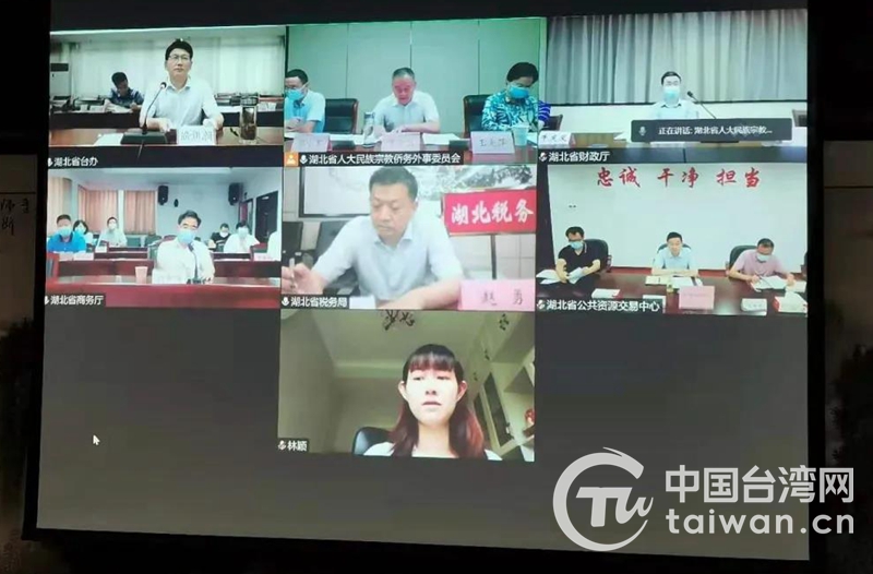 湖北省財政廳、省商務廳、省稅務局、省公共資源交易中心領導及相關處室負責人等參加視頻會。(中國臺灣網、湖北省臺辦聯合報道)