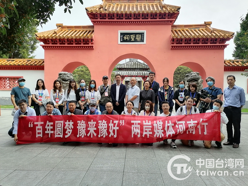 兩岸記者在醫(yī)圣祠大門外合影留念(圖片來源:河南省臺辦)