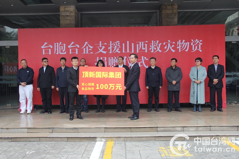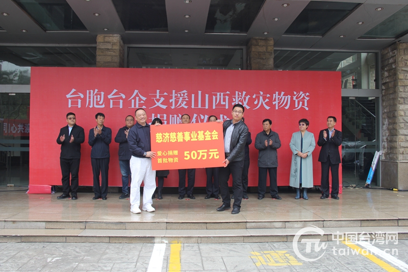 受強降雨影響,山西局部地區近日遭受嚴重雨澇災害,多地出現洪水、內澇和地質災害。災情發生后,廣大臺商臺胞情系山西,紛紛通過多種方式表達對受災同胞的關切和支持。在當天的捐贈活動中,頂新國際集團捐贈100萬元食品物資,旺旺集團捐贈100萬元食品物資,慈濟慈善事業基金會捐贈首批50萬元物資,太原市臺企協21名臺商捐款6.8萬元,臺灣中華兩岸婚姻家庭交流協會30名臺胞捐款6800元,海峽兩岸婚姻家庭協會24名臺胞捐款1.28萬元。