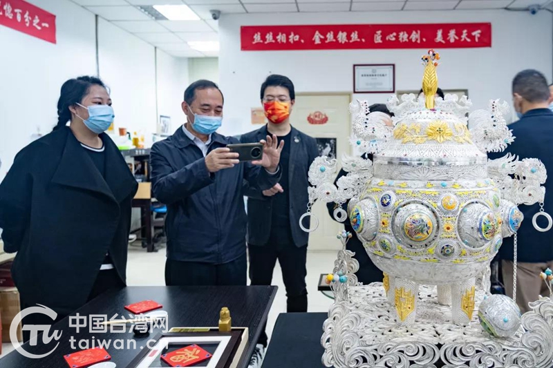在向羅治平詳細(xì)介紹漆器和銀花絲工藝與市場運(yùn)作,以及企業(yè)在推動文化“走出去”方面取得的成績后,李璐直言,“我常向島內(nèi)姐妹分享家鄉(xiāng)的美食美景、快速發(fā)展變化和良好的營商環(huán)境、政策”,在鼓勵更多姐妹返鄉(xiāng)發(fā)展上,李璐總不遺余力。隨著凝聚匠心的手作漆器、造型精美的銀花絲工藝廣受市場好評,李璐也有了更大的計劃。“目前正邀約臺灣知名文創(chuàng)人士參與企業(yè)文創(chuàng)研發(fā),為傳統(tǒng)非遺加入臺灣文創(chuàng)元素。”李璐認(rèn)為,兩岸文創(chuàng)合作潛力巨大,不同創(chuàng)意的碰撞就像“如膠似漆”的漆器工藝,一定能帶來很多驚喜。她說,下一步企業(yè)還會與在地資源做合作,開辟專區(qū)提供非遺工藝陳列展示與非遺課堂體驗。“隨時歡迎臺灣同胞尤其是臺灣青年來這里參訪體驗,也歡迎志同道合的姐妹加入我們”。