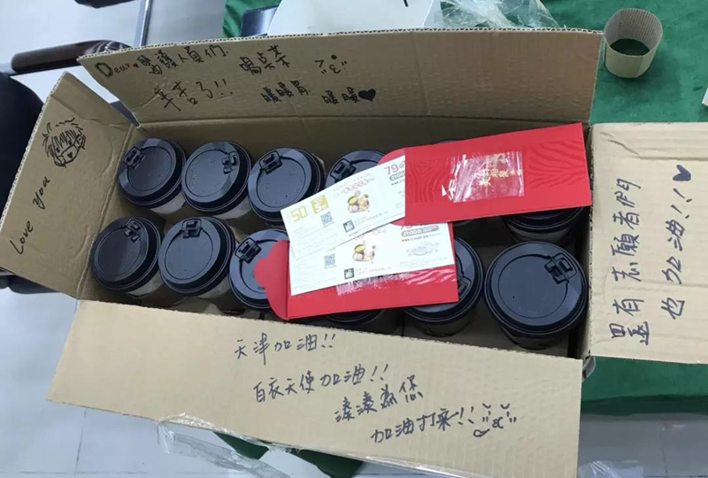湊湊(天津)餐飲管理有限公司萬象城店相關(guān)負(fù)責(zé)人員表示:“今天是臘八,天氣越來越冷了,給大家送點熱飲暖和暖和,大冷天醫(yī)護人員和志愿者們都太辛苦了,希望大家都能健康平安,共同度過此次難關(guān)!”。