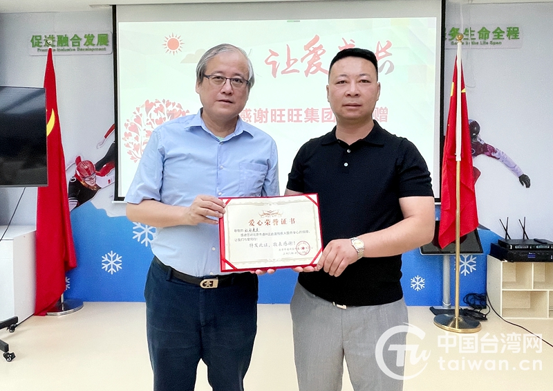 通州啟渡殘疾人服務(wù)中心創(chuàng)辦人郭文龍(左)向旺旺集團(tuán)北京首席代表、全國(guó)臺(tái)企聯(lián)常務(wù)副會(huì)長(zhǎng)林天良頒發(fā)《愛(ài)心榮譽(yù)證書(shū)》。(中國(guó)臺(tái)灣網(wǎng)發(fā))