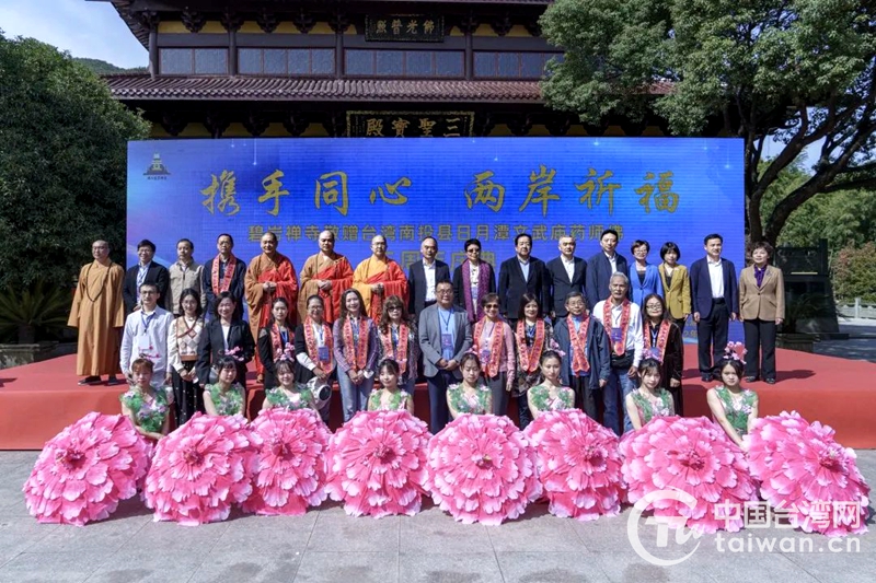 中國臺灣網10月25日訊 10月24日,浙江湖州碧巖禪寺舉辦敬贈臺灣南投縣日月潭文武廟藥師琉璃佛三周年慶典活動。該活動以“攜手同心 兩岸祈!睘橹黝},以線下線上結合方式舉行,百余名臺商臺青及兩岸宗教界人士參加。