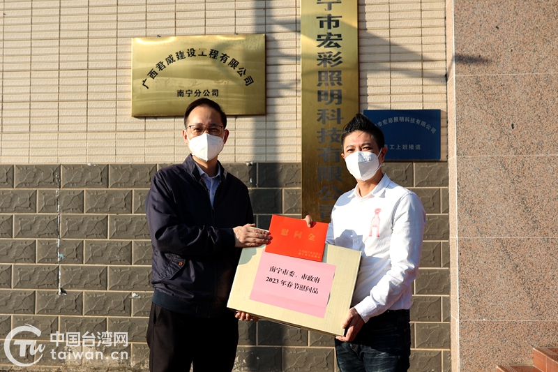 王群表示,在邕臺胞臺商是推動廣西首府城市經濟社會發展的一份子,南寧市將一如既往地關心厚愛他們,落實惠臺利民政策措施,創造更優良的營商環境,提供更舒心暖心的服務,積極為他們解難題、辦實事,助力融入當地發展。他鼓勵臺胞臺商堅定在邕發展信心,努力打拼,生活和事業一定會越來越好,希望臺胞臺商在新的一年,繼續深耕南寧,把握后疫情時代發展機遇,為南寧市高質量發展作出更大貢獻。王群還給陳輝鴻、林大為贈送了新春慰問金、慰問品,通過他們轉達對臺胞臺商的新春祝福和關心問候。