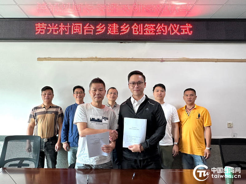 福建南安水頭鎮(zhèn)勞光村黨總支書記洪火炳與臺(tái)青團(tuán)隊(duì)鑫門町(廈門)文旅有限公司總經(jīng)理林文皓共同簽署“勞光村閩臺(tái)鄉(xiāng)建鄉(xiāng)創(chuàng)合作項(xiàng)目”。(中國(guó)臺(tái)灣網(wǎng)發(fā))