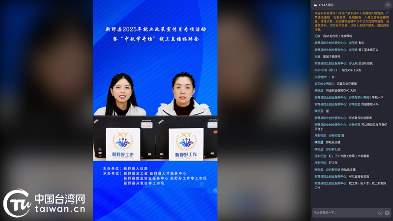 中國臺(tái)灣網(wǎng)10月10日訊 月圓人團(tuán)圓,職等你來圓。為助力企業(yè)解決用工難題,搭建高效就業(yè)供需對接平臺(tái),10月5日,南陽市新野縣舉行“2025年就業(yè)政策宣傳月專項(xiàng)活動(dòng)暨中秋節(jié)專場招聘會(huì)”臺(tái)資企業(yè)直播招聘會(huì),以“直播帶崗”形式,為企業(yè)與求職者牽線搭橋。