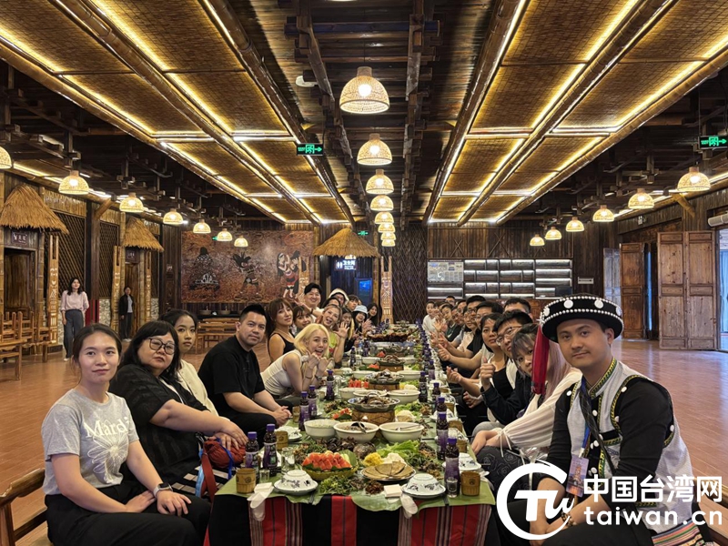 采訪團(tuán)一行在滄源佤族自治縣拍攝、體驗佤族特色美食“佤王宴”。(中國臺灣網(wǎng)記者 劉琳 攝)