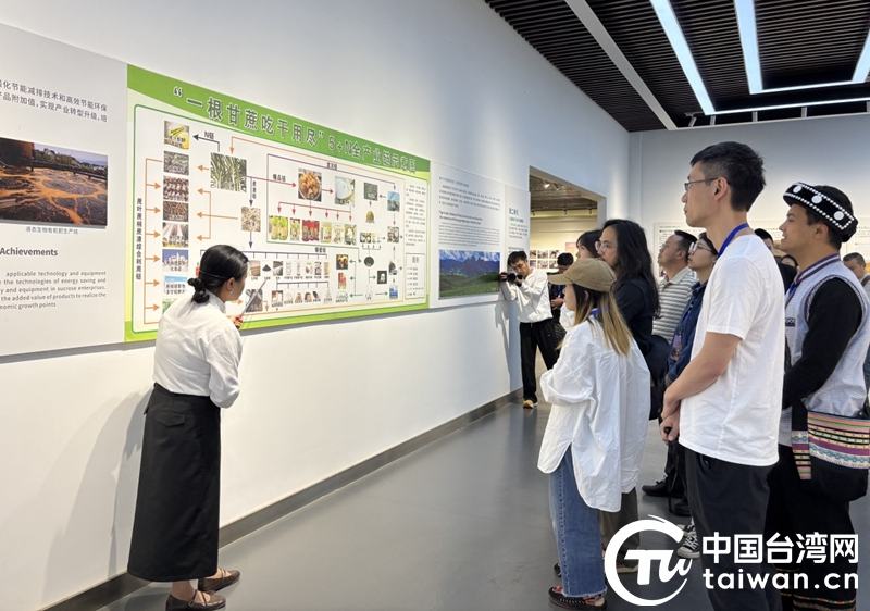 在耿馬傣族佤族自治縣的蔗糖文化展示中心,采訪團(tuán)一行聆聽講解員介紹當(dāng)?shù)亍耙桓收岢愿捎帽M”的甘蔗綜合利用鏈。(中國臺灣網(wǎng)記者 劉琳 攝)