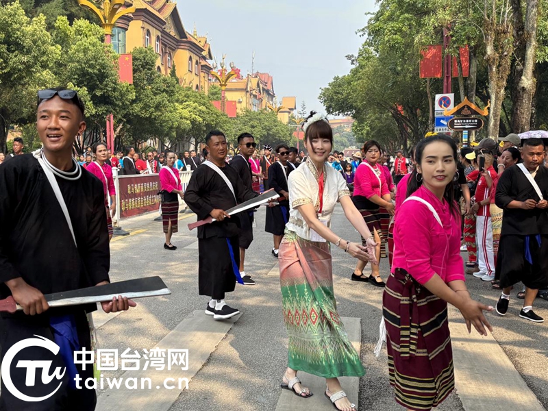 在耿馬傣族佤族自治縣觀看民族團(tuán)結(jié)方陣巡游展示時,臺灣自媒體人王安琪自發(fā)加入巡游隊伍,與當(dāng)?shù)孛癖娨煌~起歡快舞步。(中國臺灣網(wǎng)記者 劉琳 攝)