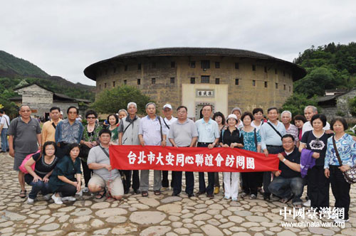 中國臺灣網(wǎng)5月16日永定消息 日前,臺北市大安同心聯(lián)誼會訪問團(tuán)一行25人到永定土樓參觀訪問。永定縣人大常委會楊德如副主任、永定縣臺灣事務(wù)辦公室林熙賢主任前往湖坑鎮(zhèn)接待、陪同。圖為參訪團(tuán)成員在振成樓前合影。(中國臺灣網(wǎng)、福建省永定縣臺辦聯(lián)合報道)