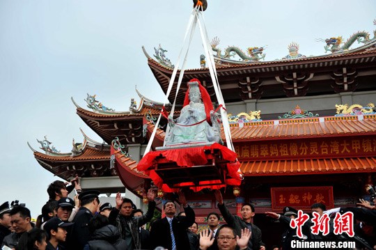 由福建湄洲祖廟分靈來臺的翡翠媽祖像,經過在大臺中地區4天3夜繞境巡游后,18日中午在臺中大甲鎮瀾宮舉行安座典禮。來自全臺各地60座媽祖宮廟的代表和上萬名信眾來到鎮瀾宮共襄盛舉。