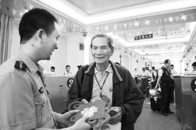 今年是媽祖誕辰1050周年,首個以整船、包船形式赴媽祖故鄉朝圣的臺灣進香團352名臺胞,6月18日乘坐“海洋拉拉”號客輪從臺灣臺中港出發,于中午1時抵達福建莆田湄洲島宮下新碼頭。83高齡的臺胞蔡明森是352名旅客中年齡最大的,剛踏進驗放通道,他就收到莆田邊防檢查站官兵送上的禮物——中國結。(吳志 攝)