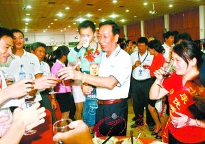 郭臺銘在席間向員工家屬敬酒。記者高鶴濤攝