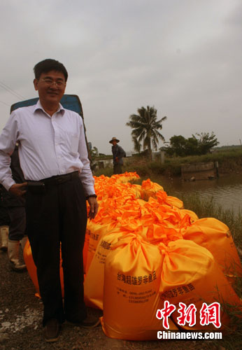 28日,臺資海南新海洋水產有限公司總經理劉財添,迎來海南省政府支持災后恢復生產的第一批魚苗。關向東 攝