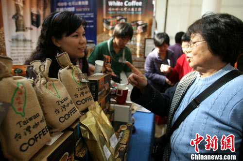 11月3日,北京市民在“中華老字號博覽會”上品嘗臺灣咖啡后,向工作人員描述“臺灣味道”。“中華老字號博覽會”于近日在北京全國農業展覽館開幕,包括港臺地區在內的各地知名老字號企業共270余家集中亮相。