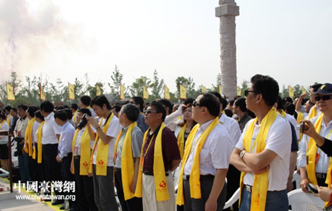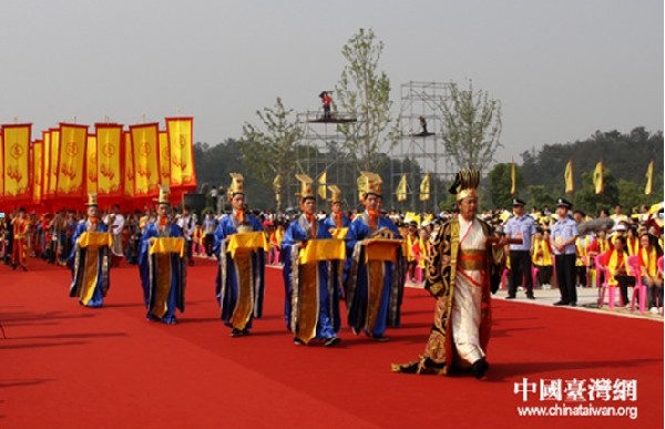 圖為由唐國強擔任主奉司官的奉祀方陣。唐國強手捧《奉祀祝辭》,神情肅穆,氣度非凡。緊隨其后的8位能士,他們手捧象征炎帝“八德”的禮器,神情蕭肅,充滿著對華夏始祖無限的崇敬。(中國臺灣網 徐維彬 攝)