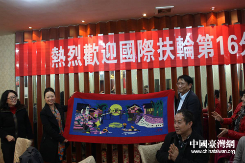 湘西州人民政府副州長向清平女士向臺灣嘉賓贈送土家織錦。