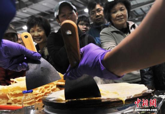 2月7日晚,北京地壇廟會的臺北之旅,借助臺北燈節今夜開幕良機在花博公園登場,傳統小吃煎餅果子格外吃香。賈國榮 攝