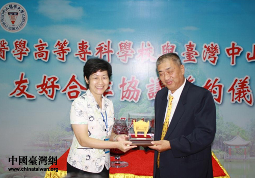 肇慶醫專校長梁瓊芳與臺灣中山醫學大學董事周明仁代表兩校互贈紀念品(圖片來源:肇慶市臺辦)