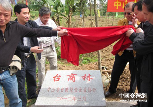 中山市臺務局黃全歡局長(左二者)、市臺商協會會長李俊德(右三)等為植種主題“臺商林”揭幕。(圖片來源:中山市臺辦)