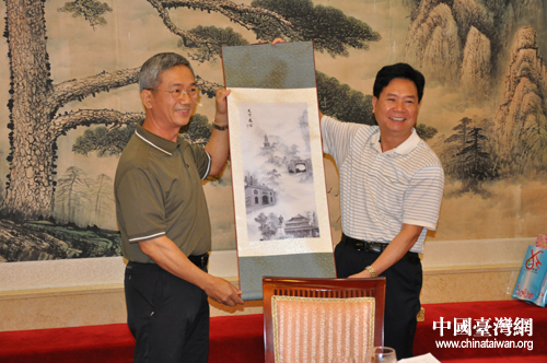 廣東省臺(tái)辦副主任蔣長(zhǎng)芳與臺(tái)中市南區(qū)里長(zhǎng)聯(lián)誼會(huì)榮譽(yù)團(tuán)長(zhǎng)李印欽互贈(zèng)紀(jì)念品。(圖片來(lái)源:清遠(yuǎn)市臺(tái)辦)