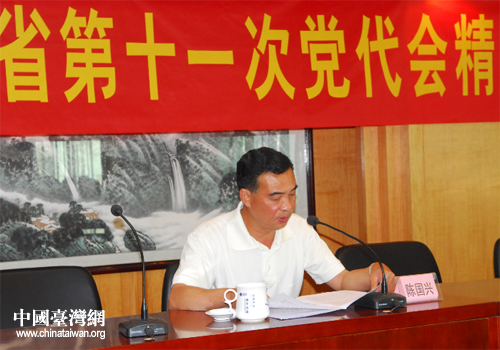 陳國興介紹了廣東省第十一次黨代會基本情況后,重點傳達學習了汪洋代表十屆省委向大會所作的報告和在省委十一屆一次全會上所作的重要講話。他指出,省臺辦一定結合當前對臺工作的形勢和任務,認真制定方案,進一步抓好會議精神的學習貫徹,把全體黨員、干部的思想認識切實統一到會議精神上來。
