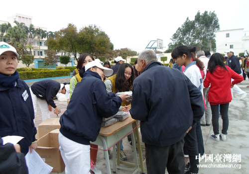 在工作人員的引導(dǎo)下,訓(xùn)練有素的志工有條不紊地進(jìn)行救濟(jì)物資發(fā)放工作。他們把大米、保暖衣褲、棉被、食用油等生活用品一一發(fā)放到低保戶手上。而操場(chǎng)中間,地豆鎮(zhèn)還組織當(dāng)?shù)貙W(xué)生與志工們?yōu)檩喓虻娜罕娝蜕巷灨杉敖,傳遞愛(ài)心。大家臉上都掛著笑容,喜悅之情溢于言表。
