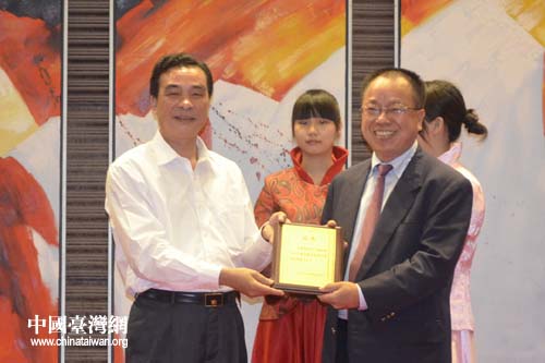 廣東省臺(tái)辦主任陳國興向新任會(huì)長許朝財(cái)頒發(fā)證書。(圖片來源:陽江市臺(tái)辦)