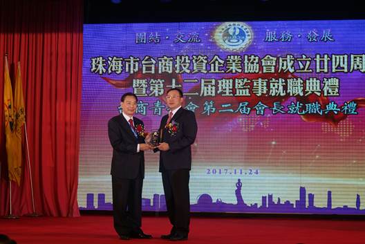 中國臺灣網11月30日珠海訊 珠海臺商投資企業協會2017年11月24日在珠海市度假村酒店舉行協會成立24周年慶典暨第12屆理監事就職典禮,第十一屆會長葉飛呈連任新一屆會長;前海協會會長陳云林、前海基會董事長江丙坤、澳門中聯辦臺務部部長徐莽、海協會駐澳辦主任楊流昌、廣東省臺辦副主任方濤、市委常委統戰部部長郭才武等領導和嘉賓近700人出席了慶典活動。