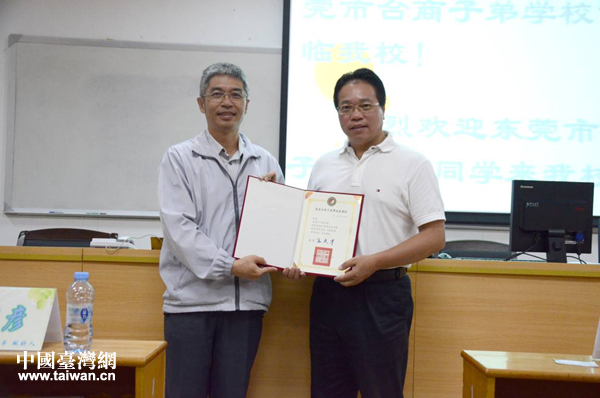 圖為東莞臺商子弟學校主任劉義龍(左一)向可園中學校長陳澤林(右一)致感謝狀。