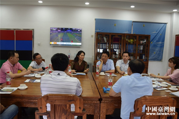 當天上午,調研組一行來到新會區體育中心參觀,并實地考察了廣東珠超聯賽有限公司,與廣東珠超聯賽有限公司董事長黃達昌及珠超臺灣球隊主教練張展維圍繞如何創建“廣東省海峽兩岸青少年交流基地”進行了深入座談交流。劉小青表示,海峽兩岸交流基地適應兩岸大開放、大交流的新形勢要求,突出兩岸交流地方特色,是深化兩岸經貿文化交流合作的新平臺。江臺兩地五人制足球領域交流已具備相當基礎,希望江門能把握資源優勢,利用珠超俱樂部平臺,發揚江臺兩地五人足球文化,共促兩地青少年交流合作,讓“兩岸一家親”理念深入人心。譚健文表示,非常感謝省臺辦對江門對臺工作的關心與支持,江門市臺辦將貫徹落實省臺辦工作要求,憑借珠超聯賽的實力基礎,打造江臺兩地青少年交流平臺,努力爭創“廣東省海峽兩岸青少年交流基地”,擴大江門對臺品牌的吸引力和影響力。