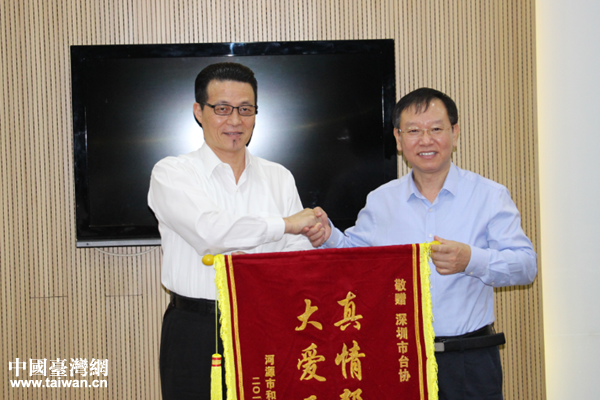 會上,謝昉柱對深圳市臺協熱心幫扶扶貧掛鉤點貧困家庭的資助表示感謝,并代表受助的兩戶貧困戶轉交了給深圳市臺協的感謝錦旗。